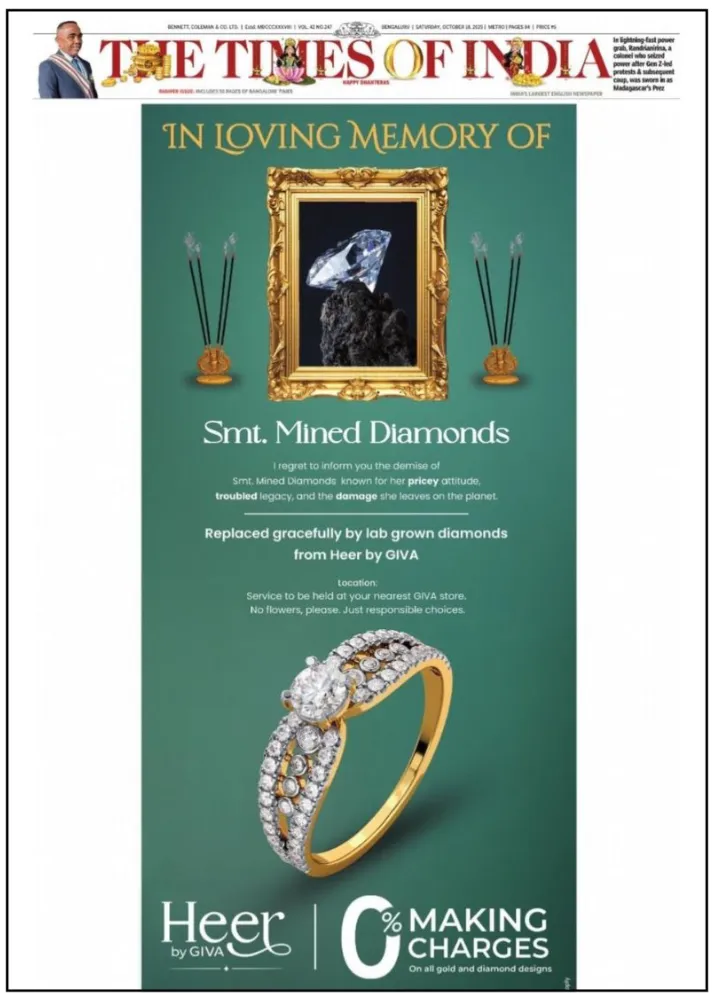 In print, GIVA has taken an unusual approach. A recent obituary-style ad highlighted the environmental cost of mined diamonds while introducing the “Heer” lab-grown collection, aligning the brand with sustainability and conscious luxury.