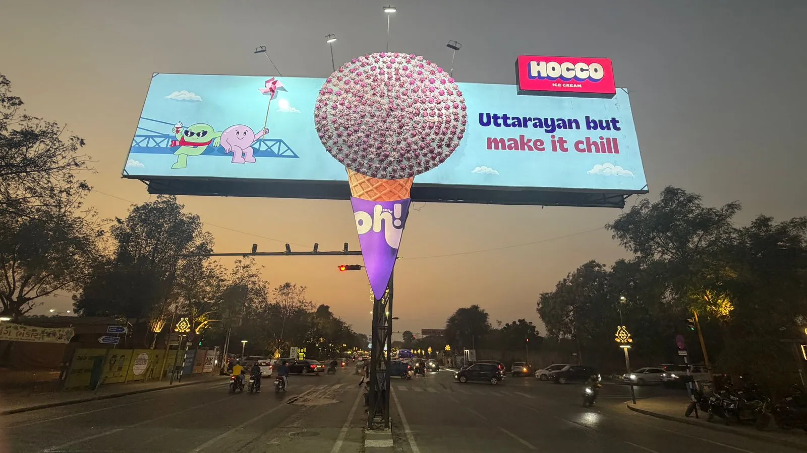 HOCCO created an OOH installation in Ahmedabad featuring a life-size ice cream cone reimagined with playful pinwheels forming the scoop, reflecting the spirit of Uttarayan by celebrating movement, colour and joy.