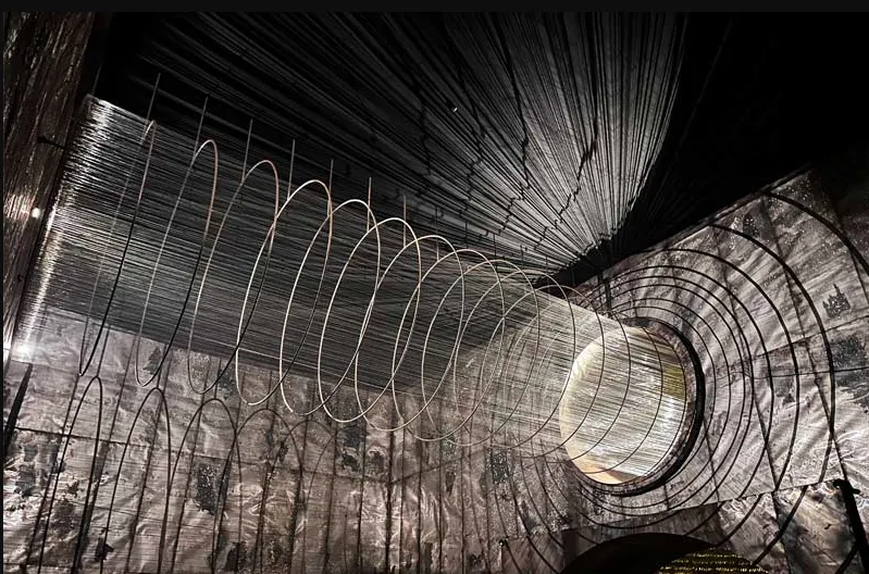 Artist Sushanta Paul’s sound wave–inspired installation at Kendua Shanti Sangha 2024 used tin sheets, steel bars, mesh, nylon threads, and reclaimed wood to evoke divine realisation.