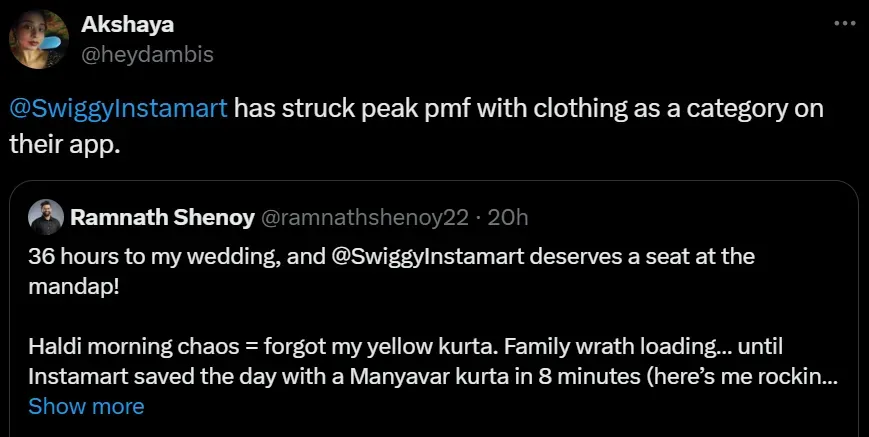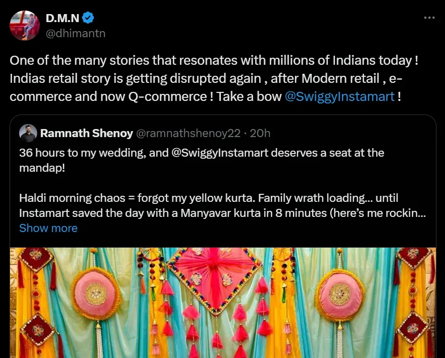 Quick commerce is not only changing advertising strategies but also forming new connections between brands and consumers during significant life events. Recently, a tweet of a groom who was rescued by Swiggy Instamart by delivering a yellow kurta for his haldi ceremony went viral. While convenience is what we look for in quick commerce platforms, being able to manage unique requests and own personal moments wins hearts.