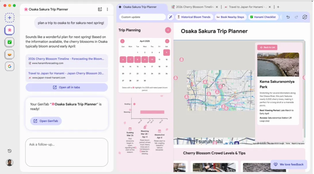 GenTabs uses Gemini 3 to understand what users are working on by looking at their open tabs and chat history. It then automatically creates small, interactive web apps to help complete those tasks. Users only need to describe what they want; the tool can refine or expand the app through natural language, without any coding. It can also suggest useful generative tools the user may not have considered. Each AI-created element links back to its original source on the web.