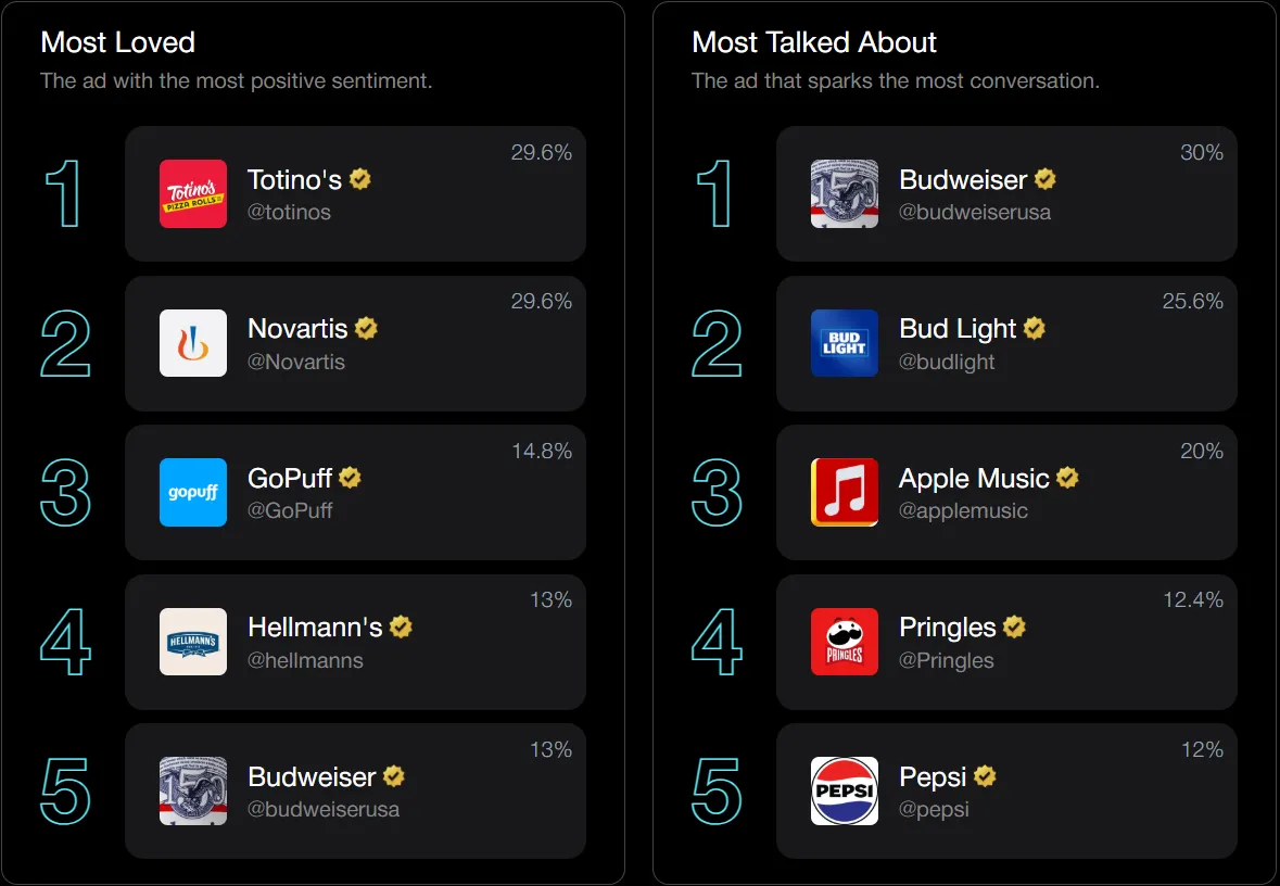 While the platform’s role in shaping broader cultural conversation might have shifted in recent years, the rankings may still offer insight into which ads are resonating most with users on the platform during the Super Bowl period.