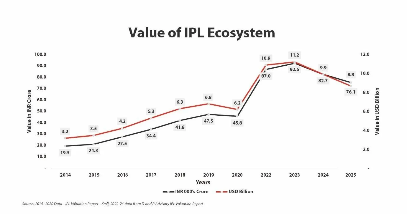 According to the report, the IPL ecosystem has now seen two consecutive years of valuation decline, falling from Rs 92,500 crore in 2023 to Rs 82,700 crore in 2024 (10.6% drop), and further to Rs 76,100 crore in 2025 (8% drop), equivalent to $8.8 billion. Analysts attribute the drop to two main factors: consolidation of media rights and regulatory restrictions on real-money gaming (RMG).