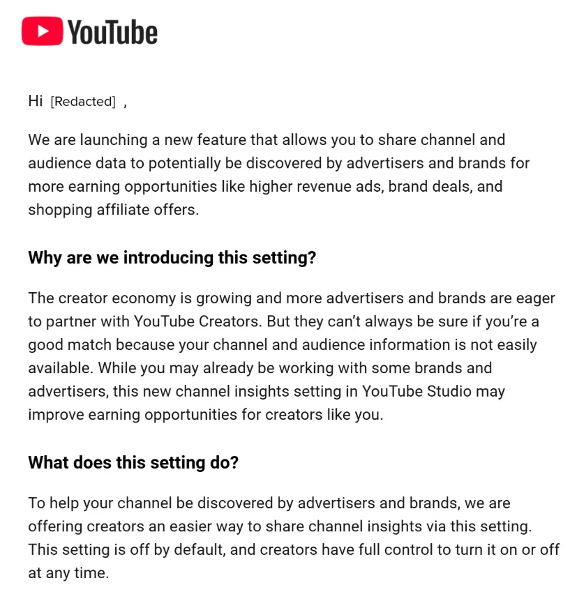 - Informed creators that they’ll now be able to share channel and audience data with brands for potential partnership opportunities.