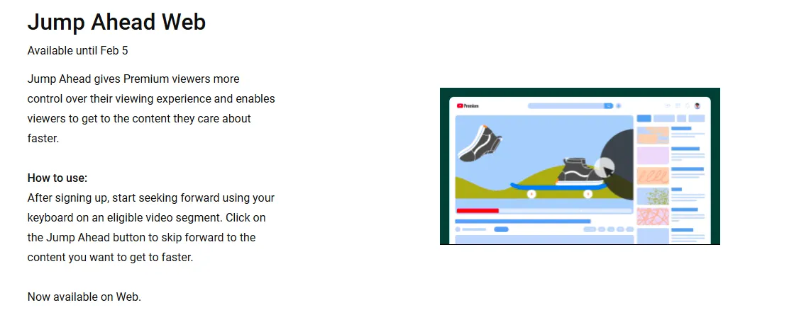 - It rolled out experimental features for Premium users, including improved audio quality, faster mobile playback and a ‘Jump Ahead’ option on the web.